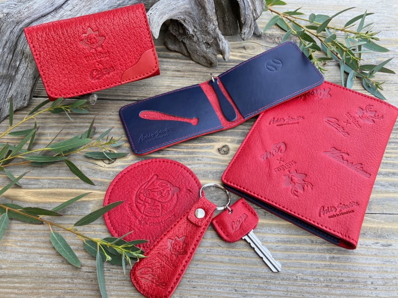 店主自らが地元の猟師さんの元へ直接足を運び、一頭ずつ状態を見極めて仕入れた原皮を使用しています。その貴重な「いのちの副産物」を、皮革の聖地・兵庫県の熟練タンナーへ持ち込み、試行錯誤を重ねて独自の鞣(なめ)しと、鮮烈な“カープ・レッド”での染色を依頼。